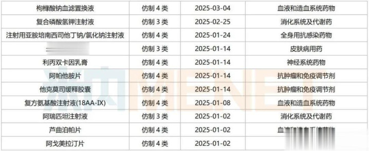 38个品种中,有多个品种为国内首批上市,其中芦曲泊帕片、注射用亚胺培南西司他丁钠/氯化钠注射液、注射用比阿培南/氯化钠注射液、奈妥匹坦帕洛诺司琼胶囊等为国内首仿+首家过评,阿帕他胺片、枸橼酸钠血滤置换液、注射用头孢他啶/氯化钠注射液等为国产第2家获批等。